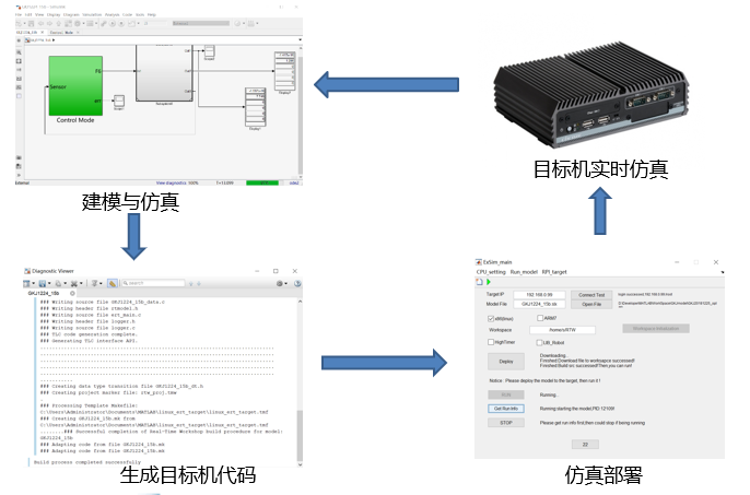 5. 實(shí)時(shí)仿真。連接目標機成功后,啟動(dòng)實(shí)時(shí)仿真??蓤绦形募詣?dòng)運行,與實(shí)際機器人系統或HIL交互;開(kāi)發(fā)工具支持在線(xiàn)調參,啟??刂?,實(shí)時(shí)數據存儲等功能;